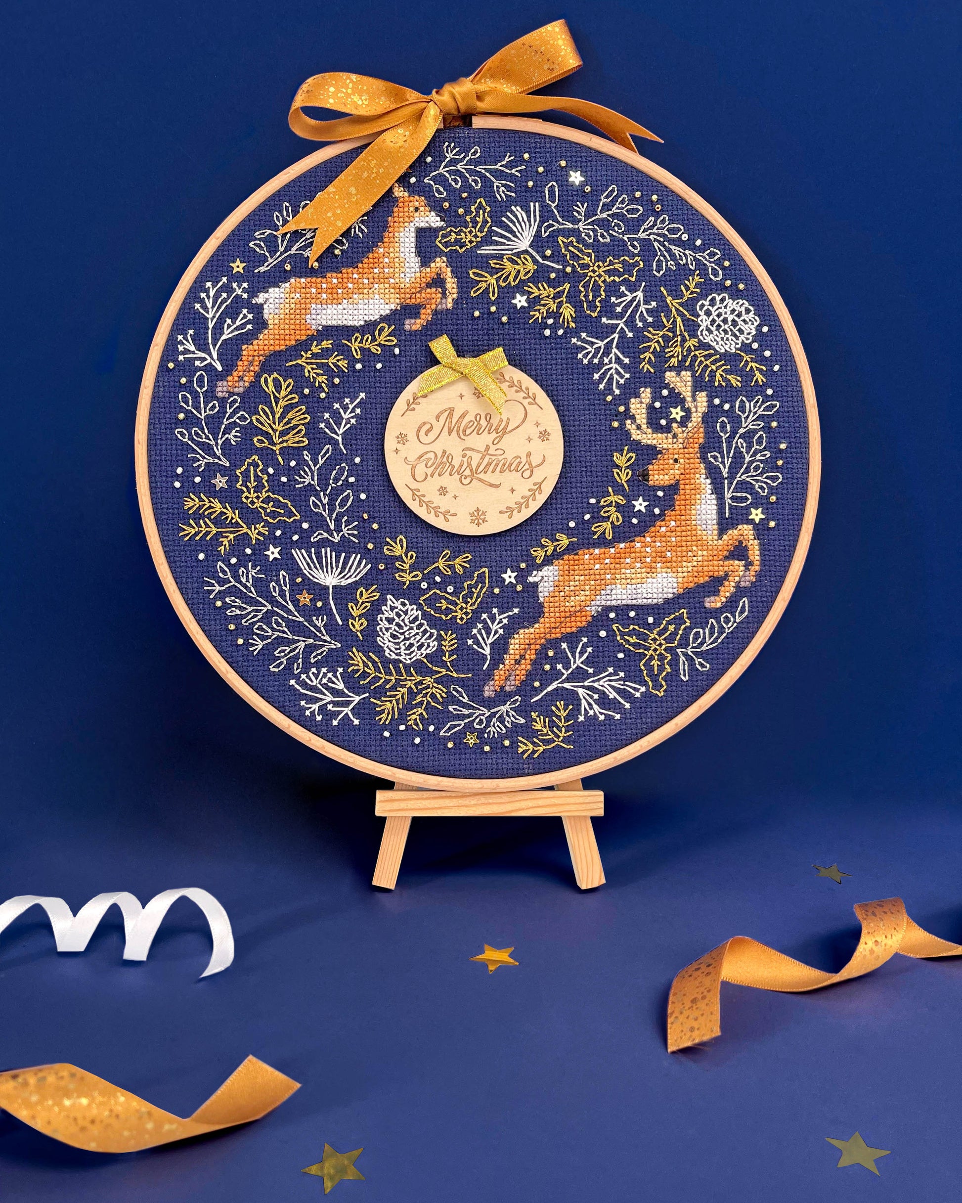 It includes pre-sorted stranded cottons and uses cross stitch, lazy daisies, back stitch and French knots. The kit also includes metallic threads, beads, sequins, a gold bow, a wooden centre 'Merry Christmas' disc, needles, a clear stitch diagram and instructions.